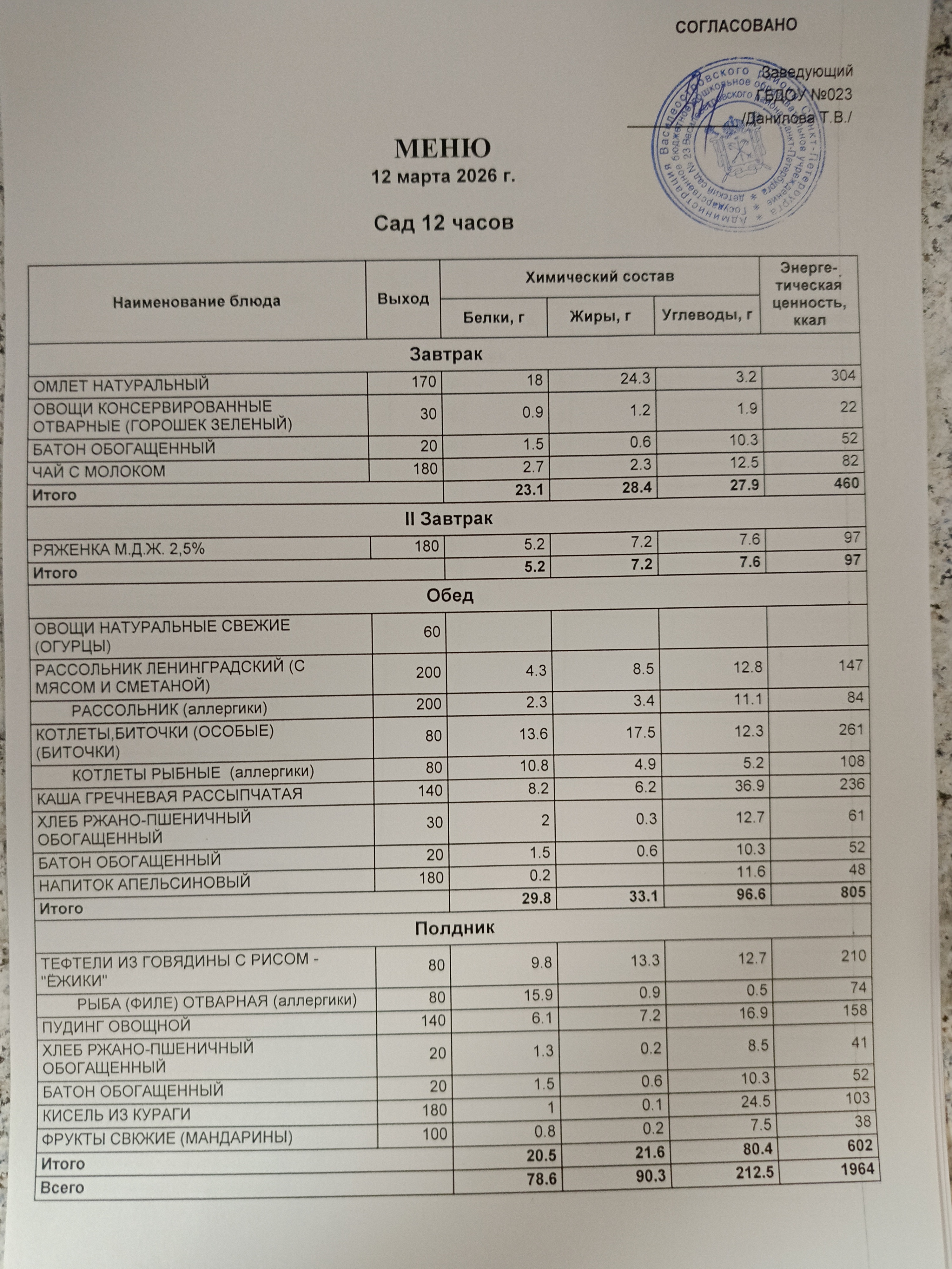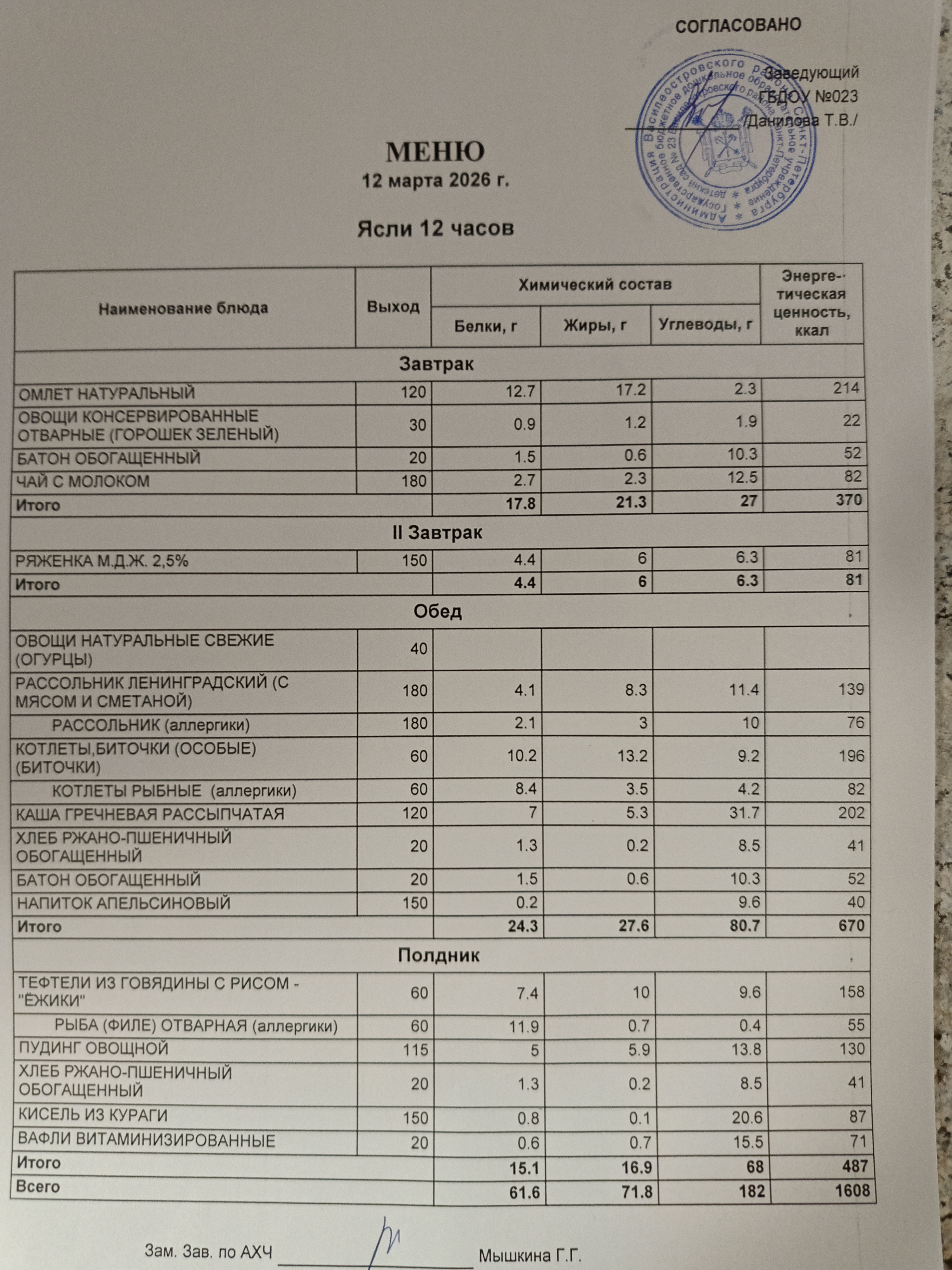 - 2. Цикличное десятидневное меню для организации питания детей в возрасте от 3 до 7 лет, посещающих с 12 часовым пребыванием дошкольные образовательные учреждения, нуждающимся в диетическом питании, при реализации основного меню для детей с требованием применения элиминационной диеты (исключение мяса и птицы).